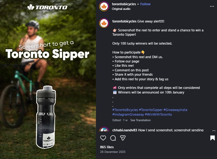 Here’s an exciting Instagram giveaway alert for cycling and fitness lovers. Toronto Bicycles is giving you a chance to win Toronto Sipper bottle.