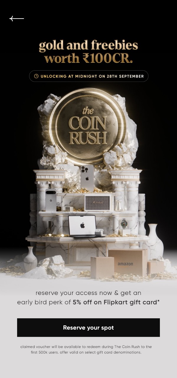 The Coin Rush unlocks at midnight on 28th September with gold and freebies worth ₹100 Crore. The first 500,000 users can reserve their spot and get 5% off Flipkart Gift Cards.