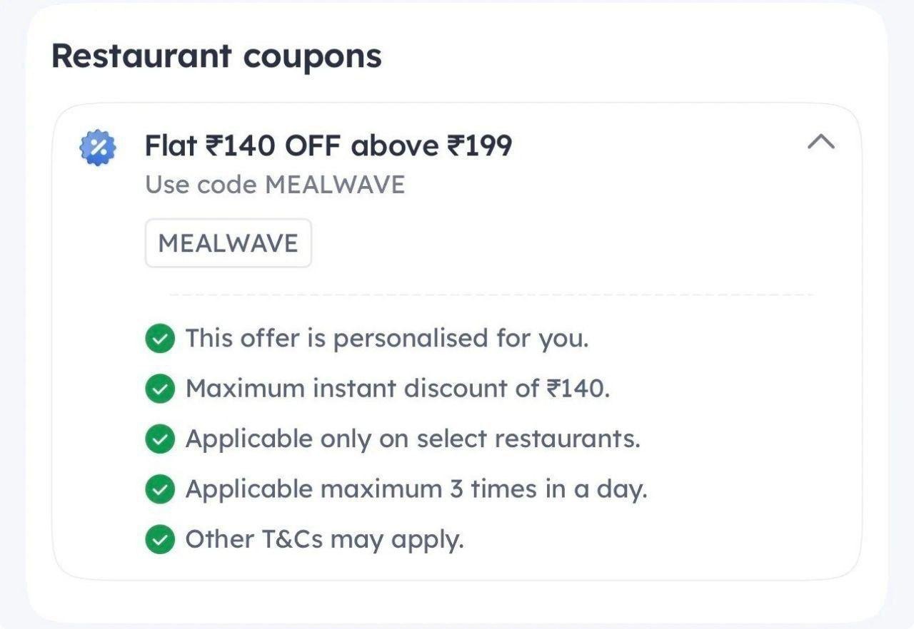 Don’t miss out on this fantastic opportunity to save on your next meal! Use the MEALWAVE code and enjoy a flat ₹140 off your order above ₹199.